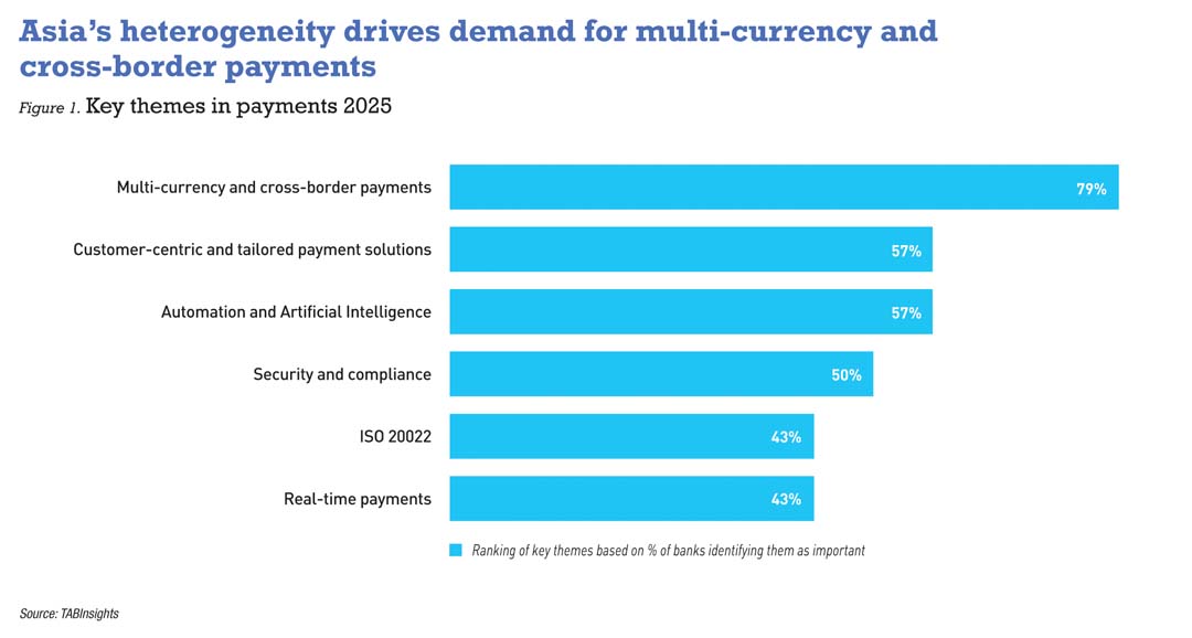 For corporates increasingly operating in a 24/7 environment, managing financial operations across multiple currencies and jurisdictions remains a key challenge. Treasury teams expect real-time visibility and seamless cross-border transfers. Yet, despite more payment channels, friction persists unless these systems can integrate smoothly. Asia Pacific’s (APAC) payments landscape remains fragmented, with diverse regulations, multiple currencies, and varied settlement practices. The TABInsights APAC Payments 2025 Survey underscores this challenge, as 79% of respondents ranked multi-currency and cross-border payments as the top theme.