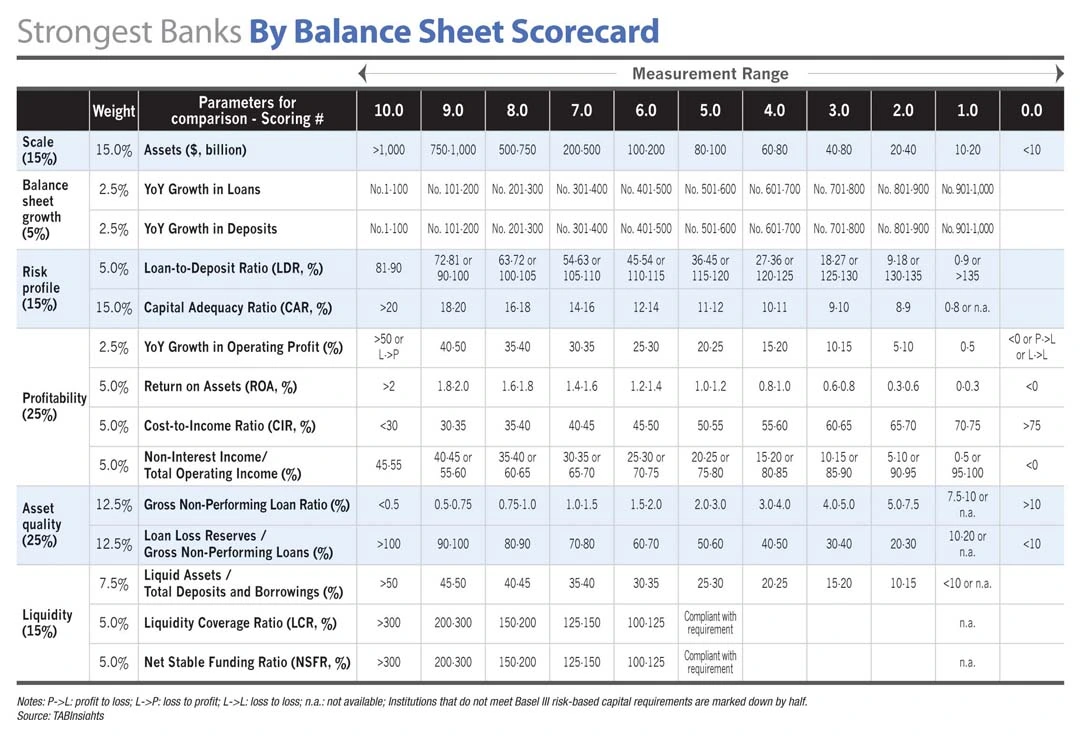 The TAB Global 1000 World’s Strongest Banks ranking evaluates the 1,000 largest banks worldwide based on balance sheet strength. It employs a detailed and transparent scorecard to assess banks and financial holding companies across six criteria: scale, balance sheet growth, risk profile, profitability, asset quality and liquidity, comprising 14 specific factors.
